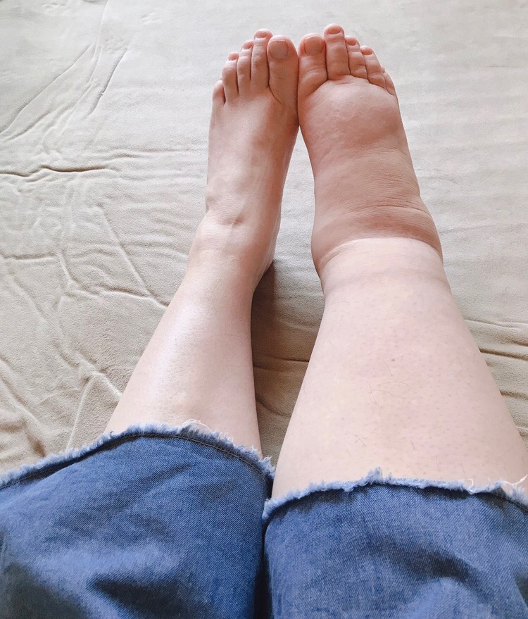 「夕方、休んでいるときの様子。足首から甲までむくみでパンパンに張ってしまいます」